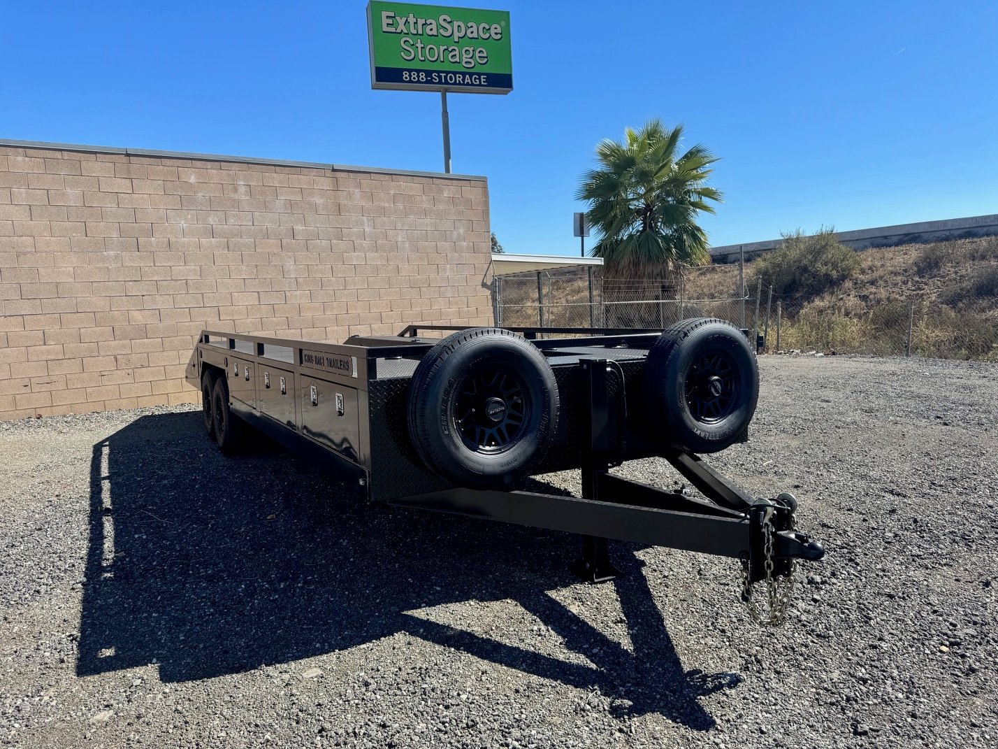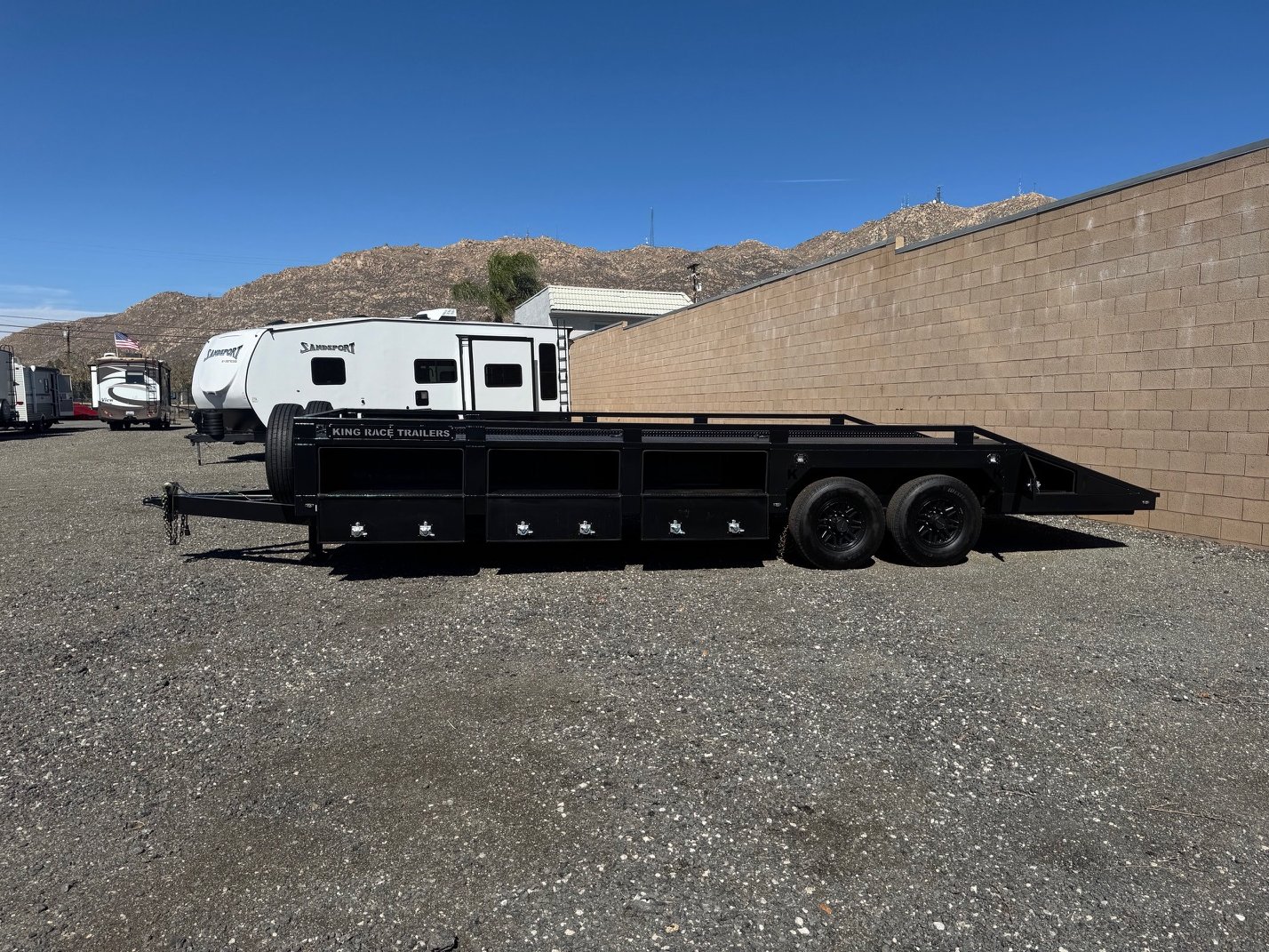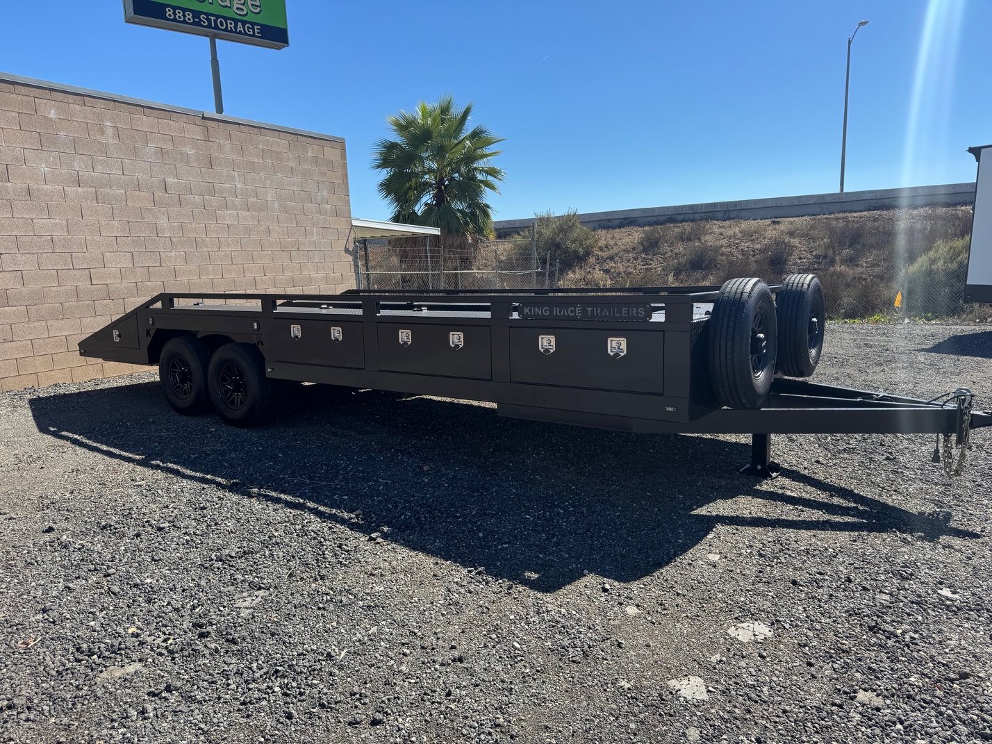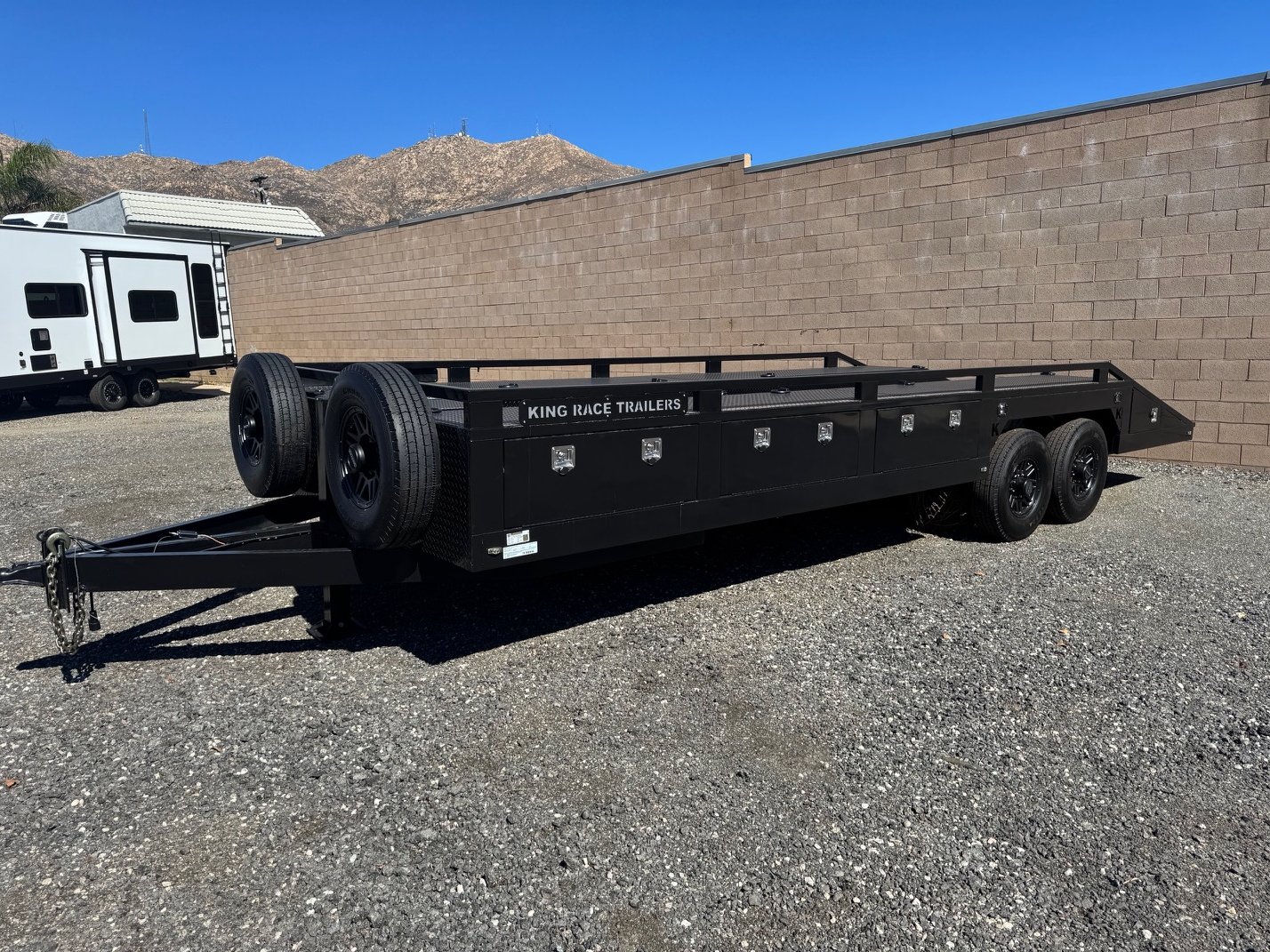 This King Race Trailer custom 24' Box Out Features flush mount Baggage doors with cam latches with built in locks.