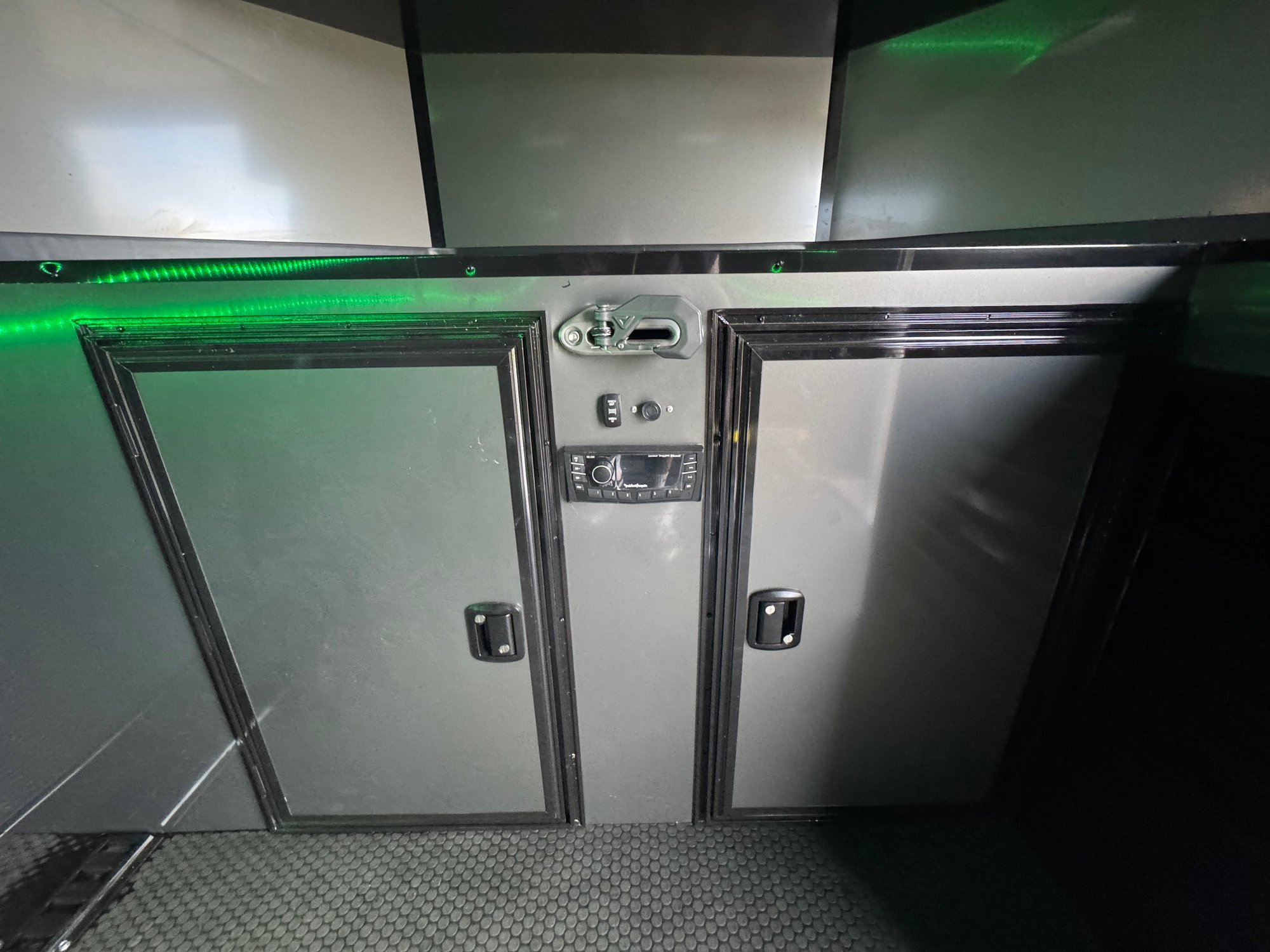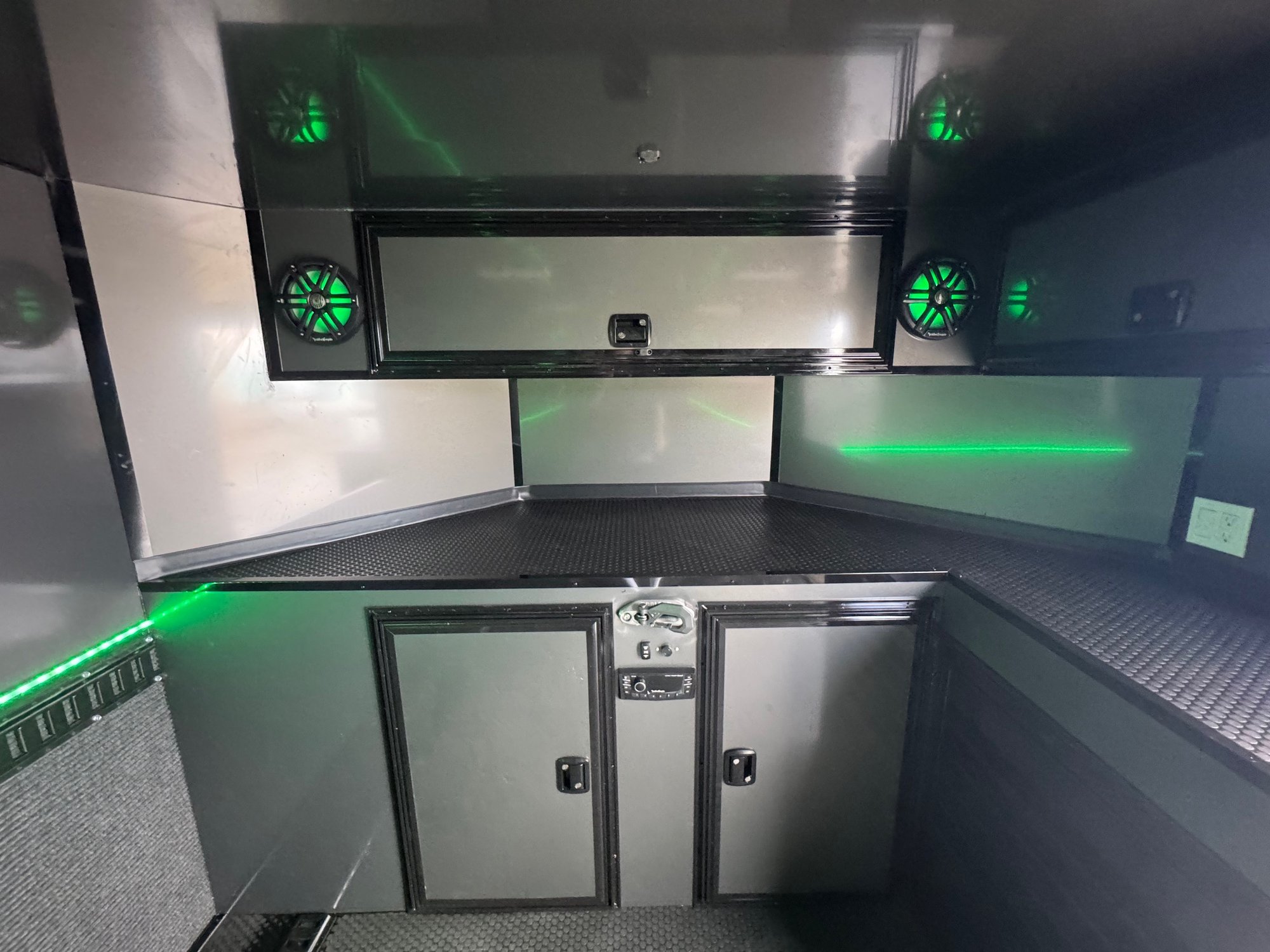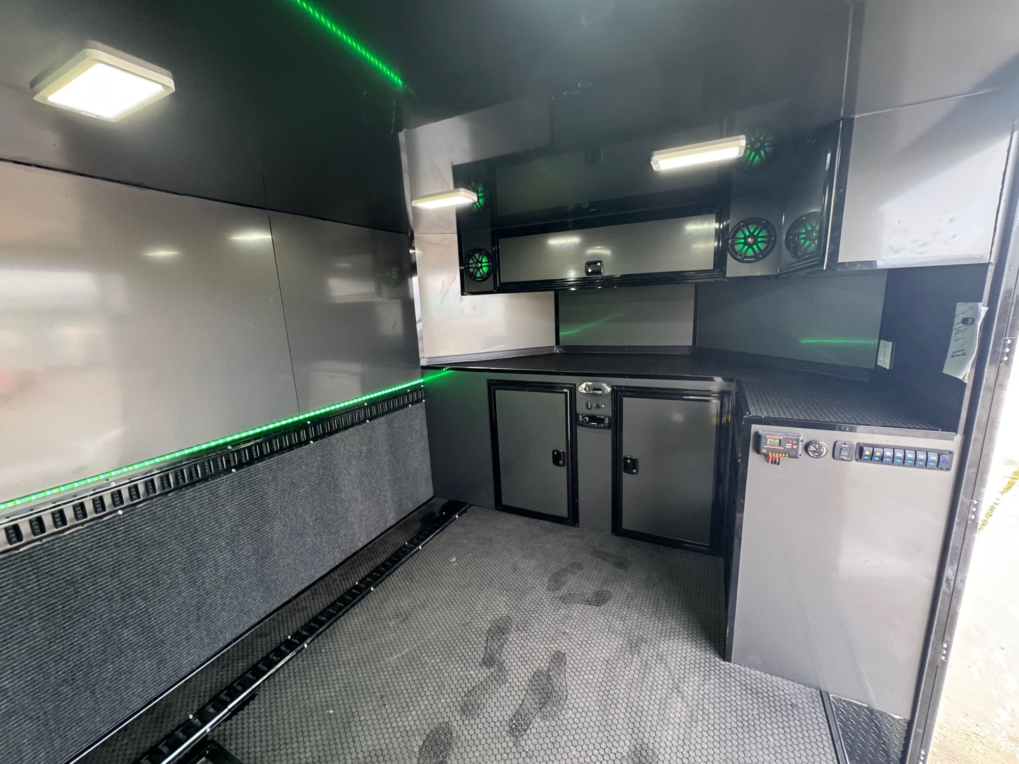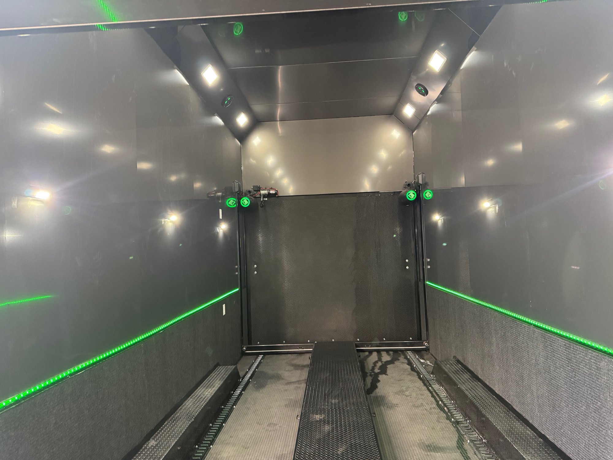 Carpeted side wall with E track on floor and walls